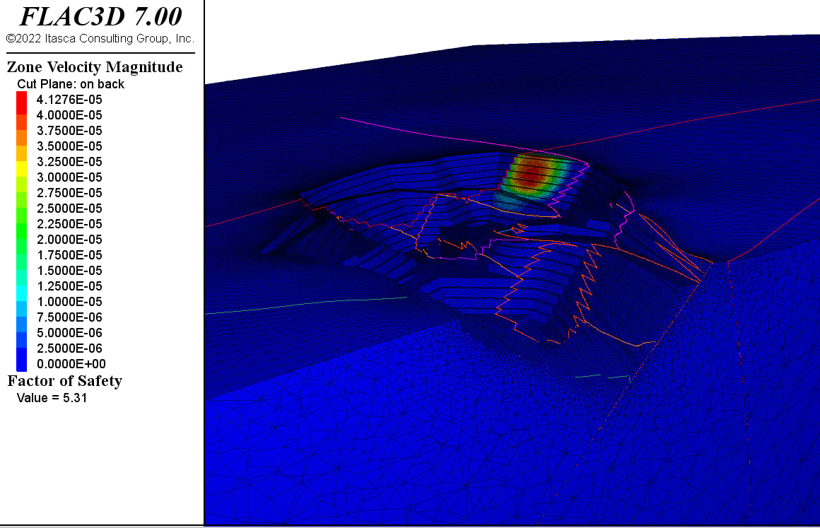 - Test02: Velocities are very low globally, with localized movement (≈1e-3) near the fault intersects the pit wall.