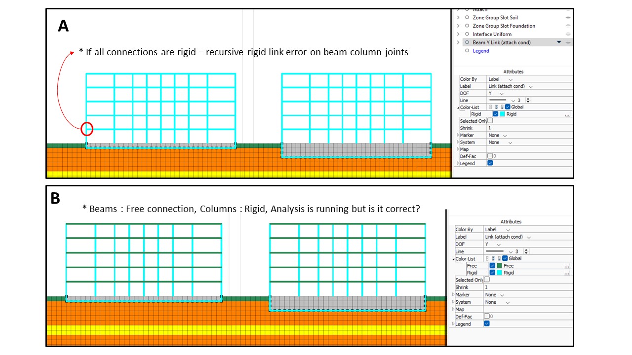 I am trying to model a 5-story building with 9 column axes in FLAC2D. For this, I created all structural members (columns, beams, and slabs) using the structure beam create by-line command. After completing the geometry, I attempted to connect the nodes with structure node join. However, I received the error message “recursive rigid link exist”. To solve this, I tried using the range-target option and manually created rigid connections for the nodes one by one. This seemed to work for some parts, but when I check the label > attach conditions, I still find several nodes that are shown as free or no-link. The analysis seems to run, but I’m observing unexpected stress values in the zones beneath the building, which I suspect is due to incorrect or incomplete node associations.